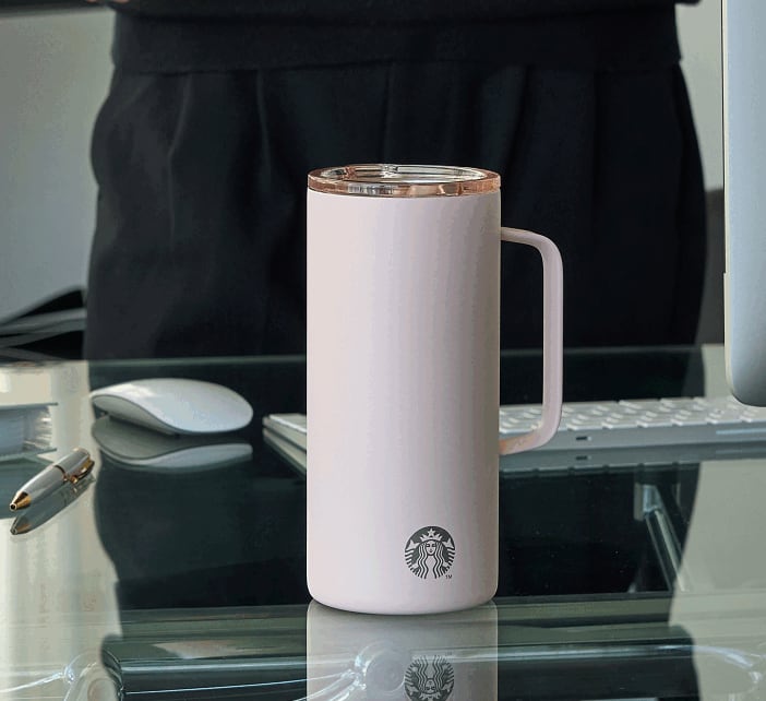 韓国スターバックスで販売されている限定デザインの真空断熱タンブラー。503mlのたっぷり容量と、持ちやすいハンドルが特徴。ミルキーピンクの上品な色味で、オフィスやおうちカフェにもぴったりのアイテムです。