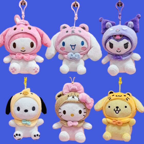 韓国で販売されている、13cmサイズのぬいぐるみ型バッグチャームです。人気サンリオキャラクターたちが、ふわふわのかわいいマスコットになって登場。キーホルダーやバッグチャームとして使えるアイテムで、子どもから大人まで楽しめます。