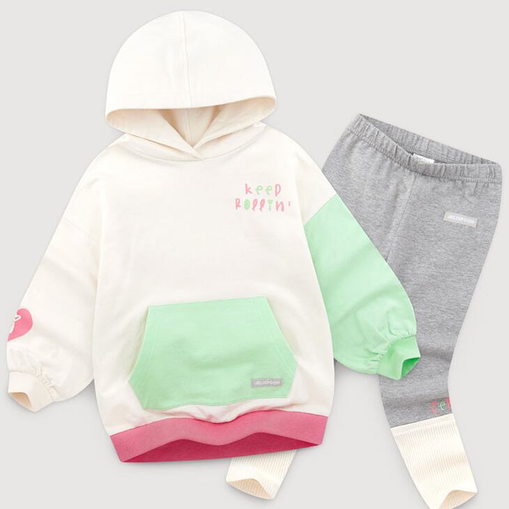 「カラーブロック フーディーセットアップ」は、明るくやさしい色合いがかわいい韓国キッズウェアです。