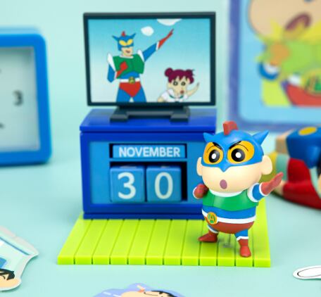 アクション仮面に変身したしんちゃんフィギュアと、日付ブロックを組み合わせて使える万年カレンダーです。テレビ画面風のフレームとカラフルなデザインがデスクまわりを楽しく彩り、どの月・日付にも自由に組み替えて使える実用性の高いアイテムです。キャラクターディスプレイとしても存在感抜群で、コレクションとしても魅力的な一品です。