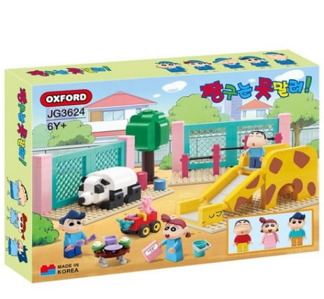 しんちゃんたちと一緒に遊具エリアやパンダエリアを組み立てて遊べる、OXFORD製ブロックセット。すべり台・鉄棒・パンダ模型などのギミックに加え、キャラクターフィギュアも付属し、作品の世界観をそのまま楽しめる構成です。