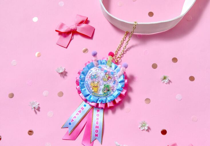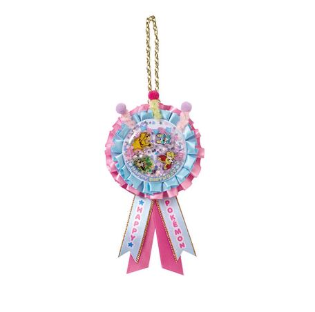 ポケモンストア限定「Birthday Party Edition」デザインのエンブレムキーリング。リボンとロゼット風デザインに、ピカチュウなどポケモンたちが描かれた華やかなアイテムです。バッグやポーチにつけてアクセサリーとして楽しめます。