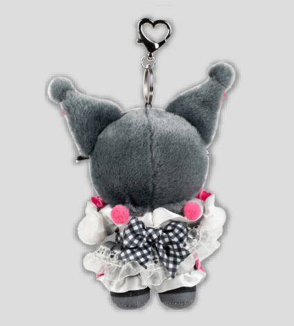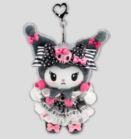 ブラック×ピンクの配色が可愛いクロミのマスコットキーホルダー。ドット&ストライプの大きなリボンに、フリルたっぷりのドレスがポイント。甘すぎないガーリーデザインで、バッグにつけるだけで存在感抜群。