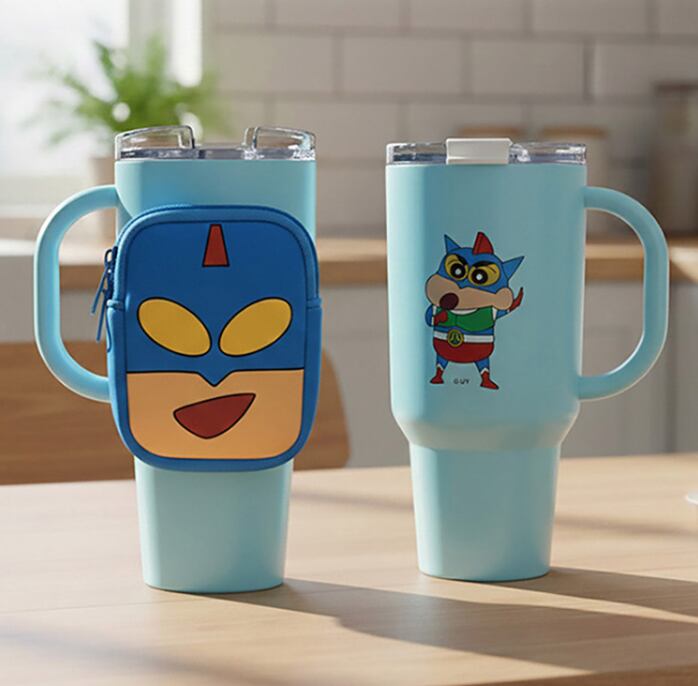 人気キャラクター「アクション仮面」デザインの大容量タンブラーとミニポーチのセット。持ちやすいビッグハンドル仕様で、日常使いからドライブまで幅広く活躍します。ポーチは取り外し可能で、小物やお菓子の収納にも便利な実用性の高いアイテムです。
